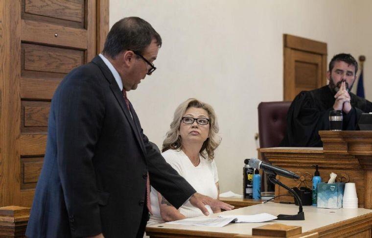 Kari Newel is questioned by Sedgwick County District Attorney Marc Bennett about how former Marion police chief Gideon Cody told her to delete text messages. Travis Heying/Wichita Eagle pool photo Photo Credit: Travis Heying